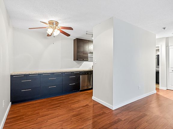 Huge primary bedroomGalley kitchenModern dark kitchen cabinetsStainless steel appliancesGranite countertopsLarge in-suite storage room