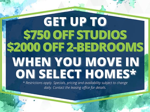 - Special offer! Save up to $750 on Studios and $2000 on 2-Bedrooms when you Move in on Select Homes! *Restrictions apply. Specials, pricing and availability subject to change daily. Contact the leasing office for details.