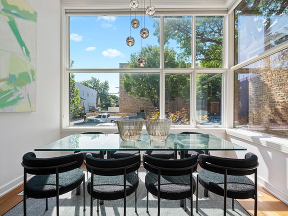 Welcome home to this sprawling modern oasis with five bedrooms, 3.5 bathrooms, a family room, dedicated office, wine cellar, and sauna. Located in the sought-after Pritzker School District, this over 5,000 sq ft modern masterpiece is just steps from Division Street and all the best that Bucktown and Wicker Park have to offer. Soaring ceilings throughout (10-12 feet) create an airy, dramatic feel. The ideal layout includes 4 bedrooms and a full laundry room on the upper level, along with multiple outdoor spaces-deck over the garage and a rooftop with unobstructed panoramic city views all year round. Light floods the home from every direction, thanks to a rare rear exposure and neighboring side yard. The chef's kitchen features professional-grade granite countertops, Arclinea cabinetry, Miele and Sub-Zero appliances, and opens to both the living room with fireplace and a stunning family room with separate dining area. This large and perfectly appointed kitchen makes cooking and entertaining a true experience. The primary bedroom provides you with serene privacy and the ultimate place for relaxation. Your en suite primary bath is truly spa-like, with a separate soaking tub, steam/shower system, and radiant heated floors. The incredible lower level includes a guest suite, a nearly 400-bottle brick wine cellar, second laundry center, and sauna. Zoned HVAC and a 2-car garage complete this exceptional home. No detail soared with recent updates to include new water heater, snow melt on stairs and walkway to house, newly installed decking on rooftop and additional decking and netting installed on garage roof. Ideally located between the intersection of Milwaukee Avenue/Damen Avenue and Western Avenue, near the North Branch of the Chicago River and the 606 Trail, enjoy walking to top rated restaurants, shopping, easy access to parks, public transportation and an abundance of activities.