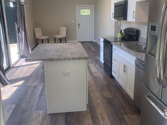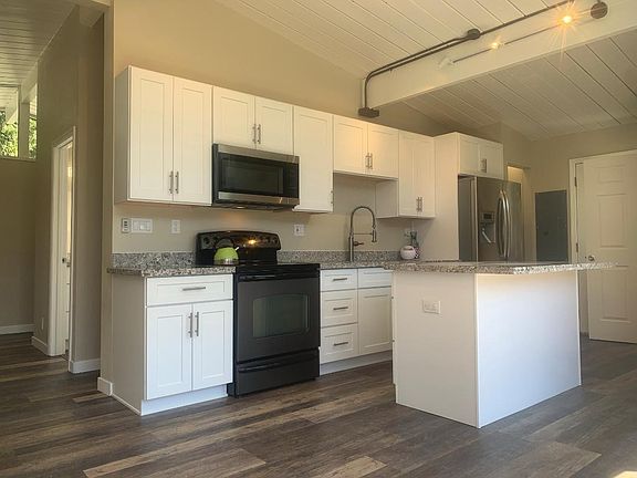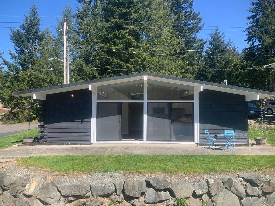 Inside you'll be bathing in light with transom windows, skylights & double sliding glass doors! This humble abode offers many stylish fixtures, laminate flooring; vaulted, wood paneled ceilings; an open concept living area; kitchen island with breakfast bar- all appliances; stacking W/D; tank-less water heater; 2 bedroom- one is decent sized & the 2nd is pretty small; one full bath- all highlighted by skylights & ceiling fans. Portable A/C included as needed. The double sliding doors open to your large patio with lake view and epic bird watching. There is no real yard. No fence. A small patch of grass on one side and the space extends only to the rockery, off the patio, in the photos.