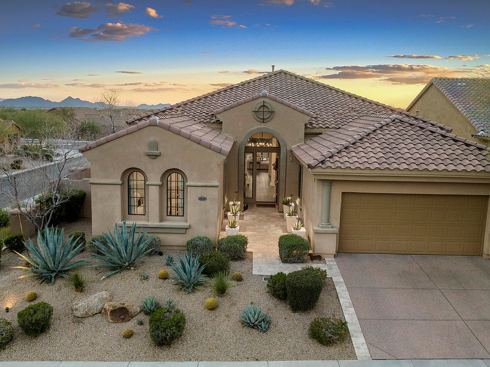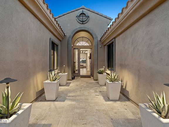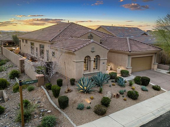 This popular Toll Brothers Solaria plan shows like a model and has upgrades throughout. Great floor plan features a large great room w/ 3 beds, 3.5 baths, plus office, 12 foot ceilings, hardwood & tile flooring throughout. Chef's kitchen boasts custom cabinets & hardware, stunning quartz counter tops + wolf-subzero appliances w/drink drawers. All of this overlooks the large great room w/stacked stone floor to ceiling linear gas fireplace. The 4 Panel wall slider opens to your private outdoor sanctuary for perfect entertaining. Covered patio w/speakers & built in-ceiling heaters, water feature, gas fire pit, built-in BBQ/bar & Bocce ball court complete this home. Luxurious master suite with calcutta marble en-suite bathroom & 2 large closets all backing to lush green belt w/sunset views!!
