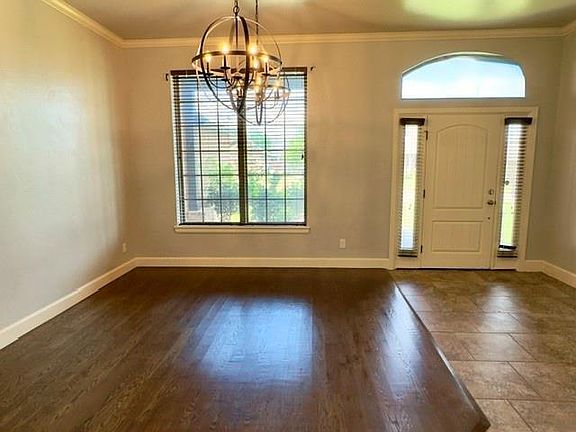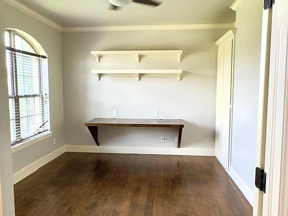 Sprinkler systemSplit floor planHardwood floorsCrown moldingSpacious covered patioCustom woodwork