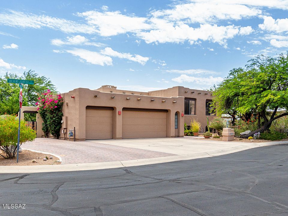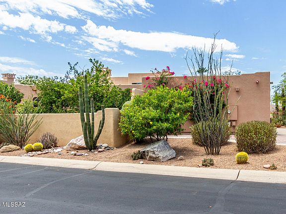 Seller is offering $10,000 in concessions with a full price offer. Welcome to this gorgeous 3,270 sq ft home nestled on a corner lot in a peaceful cul-de-sac, offering the perfect combination of space, style, and comfort. This remarkable property has all the comforts of home that anyone could ask for. This hard-to-find, split-level design is ideally located in the heart of Oro Valley in a wonderful golf community. The Sante Fe architectural style is truly a gem with great curb appeal that is warm and welcoming. Don't forget about the expanded driveway that allows off-street parking for five cars. This beauty features 5-bedrooms, 3.5-bathrooms, 2-beehive gas fireplaces, a sparkling pool, two bays of the 3.5-car garage have been converted (with permits/inspections through the city) into an additional living area which makes an ideal game/music/flex room. This is completely reversible if desired, but is an asset for musicians, artists, hobbyists, athletes, or work from home professionals. The living room is located on the main floor and has a 12' tall ceiling made of warm, knotty timber supported by 18"+ diameter viegas ringed by bright windows and accentuated with a beehive natural gas fireplace. Off the main living room is a custom, maple wood staircase with a skylight at the top. Seven steps down leads to an additional living area with three full size windows, a wet bar, and second beehive gas fireplace. Also, downstairs there is a full bathroom and two bedrooms - each with a full-size window. Upstairs is real wood flooring leading to the primary bedroom with soft carpeting, and an ensuite bathroom that includes both a garden tub & separate shower, granite countertops, and dual vanities. There are two additional bedrooms upstairs with soft carpeting & laminate flooring & both share the hallway bathroom. The south facing backyard includes a covered patio with access doors from both the kitchen and living room, swimming pool with VFD pump and sand media filter, expanded PaveStone patio, artificial turf play area, and room on the West side yard for a 15' diameter trampoline. The east side yard has a paver walking path lined with orange, tangerine, lemon, and grapefruit trees. Updated, solid surface, countertops in the kitchen and all bathrooms. Central heating/AC is only a few years old. The home was completely replumbed and includes a new hot water heater with a circulation system. Roof recoated about two years ago. Located near great schools. It's about a 1-mile walk to the Oro Valley Community Center which features tennis, pickleball, a gym, and a swimming pool for an added fee. The Oro Valley Library is a 1.2 mile walk. There is easy access to medical facilities, dining, shopping, trails, bike paths, and multiple parks. This gem has everything you've ever dreamed of!