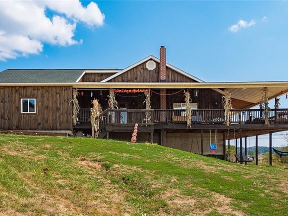 Enjoy country living on this 10-acre farm featuring fenced pastures and a well-kept hen house—ideal for livestock, horses, or hobby farming. This 5-bedroom, 2-bath home offers an open kitchen with oak cabinets, hardwood floors, and a large island. The primary suite includes a walk-in closet, a jet tub, and a walk-in shower. Most of the windows throughout the home have been replaced, adding comfort and efficiency. Recent updates also include new wood siding and new roofs on both the home and the barn. Outdoor living is enhanced by a wide covered deck and a brick patio with beautiful views. The property also offers a barn, a 3-bay open garage, and a basement plumbed for additional living space.