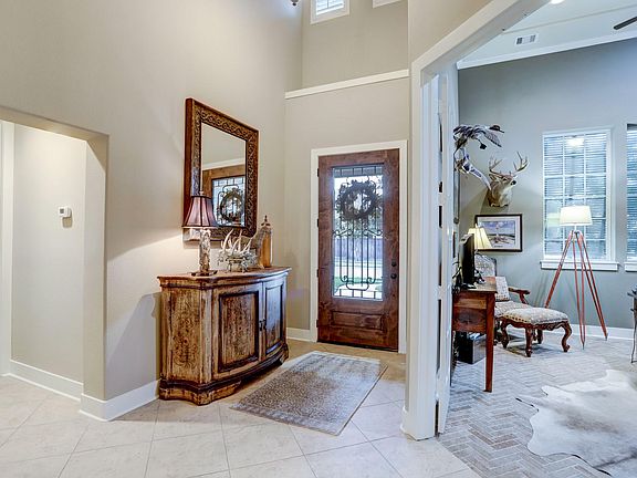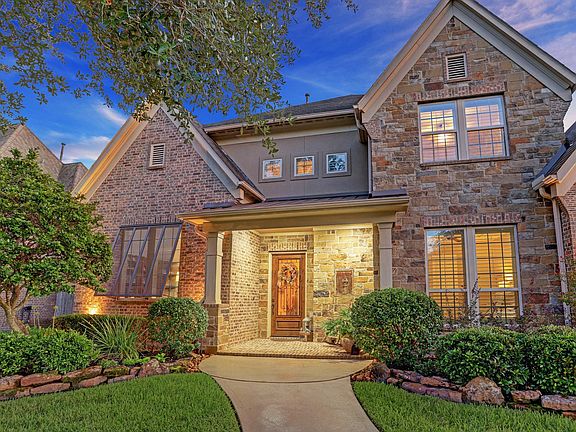 Located in a gated,luxurious resort style community featuring lakeside living scenic jogging trails, playgrounds & community pool, this stylish home is move in ready! The entryway has soaring ceilings & sweeping staircase lead you to this wonderful 4 bedroom, 4.5 bath home. Study had brick flooring & 14' ceiling, 1st floor guest suite has private bath. Formal dining is great for hosting. Chef's kitchen has walk in pantry SS appliances, sweeping island 42" cabinets, breakfast room is open to family room which is perfect for entertaining with beautiful views of back patio with charming gas lamp fixture, fabulous pool/spa and summer kitchen. Primary bed includes a sumptuous en suite, huge walk in closets and private sitting area. Upstairs has two large bedrooms, two baths, incredible storage including one that could easily be converted to a media room. Gameroom is lovely with patio with captivating lake views. Truly a resort atmosphere where you can relax, rejuvenate & be inspired!