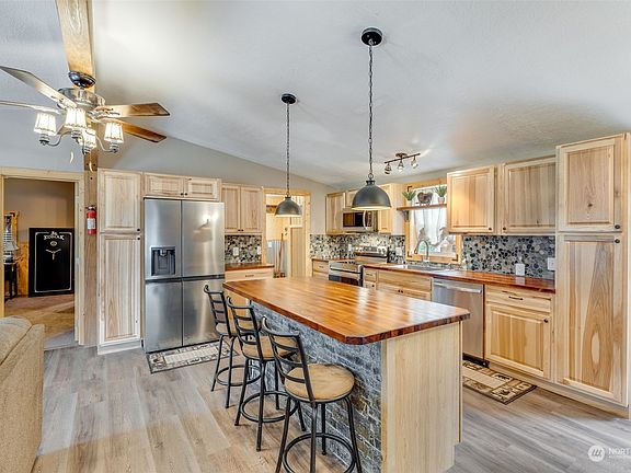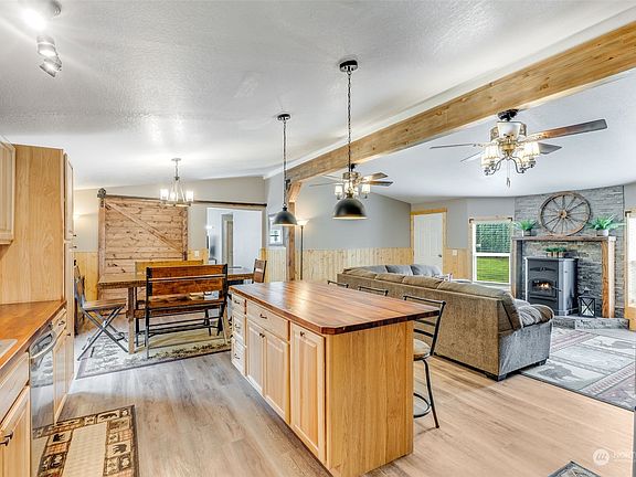 Welcome to this stunningly FULLY remodeled home on nearly 3 acres in the quaint town of Orting! Step inside to find a cozy cabin vibe with new appliances, hickory cabinets, butcher block countertops, and a beautiful stone backsplash. New lighting, LVP flooring throughout, and FOUR different custom barn doors. The living room is highlighted w/ pine tongue & groove, a beautiful solid wood beam and pellet stove. Rustic charm at it's finest! Large shop with an attached office, add'l pole building, & fully fenced lot with a dedicated acre for animals offer endless opportunities. Plus, enjoy a spacious chicken coop, firepit, garden, and RV hookup for guests. Don't wait—this gem won’t last!