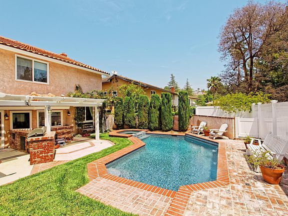 Dreams do come true in this upgraded 5 bedrooms Porter Ranch pool home* Magnificent & breathtaking exterior* Gourmet chef’s kitchen with granite counters, custom cabinets, stainless steel Viking appliances including 6 burner cooktop, walk-in pantry, double oven, oversized kitchen sink, recessed ceiling & eat-in area* Adjacent family room with fireplace* Crown moldings in the living room(fireplace) & formal dining room* Enormous upstairs bonus room with 2 balconies & vaulted ceiling* Master suite that offers a fireplace, walk-in closet, & private bath with separate tub and shower* Marble counter & flooring in the upstairs hallway bathroom that boasts double sinks, a jetted tub and separate shower* Dual pane windows throughout* Harwood flooring* Recessed lighting* Dual zone A/C* Circular staircase* Formal entry* Gorgeous rear yard that features a built-in BBQ center, covered patio with ceiling fan, beautiful pool & spa with brick decking, and large grassy area to entertain your friends and family on those hot summer days* Large 3 car garage with built-in cabinets* Award winning schools including Granada Hills Charter HS!!