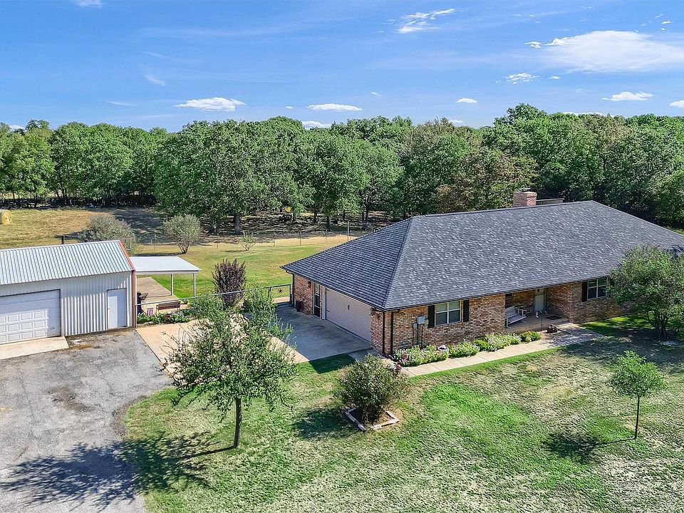 Country living with peace and tranquility! Located North of Whitesboro just minutes to Lake Texoma, this 11.9 acre property combines pasture, trees and plenty of peace and quiet. Recent updates throughout the four bedroom and two bath, brick home including: flooring, countertops, paint, complete master bath update and woodworking touches. Enjoy the morning and evenings sitting out in the sunroom or covered patio watching nature come to life. Outside you can enjoy a dip in the pool, work in the oversized metal shop building or raise animals. Great opportunity to have a small place in the country.