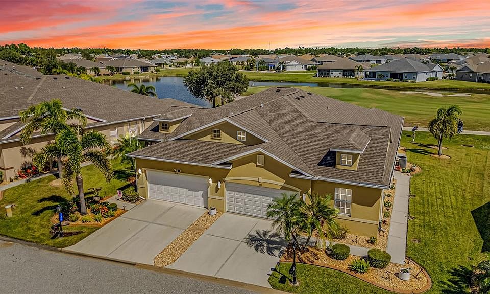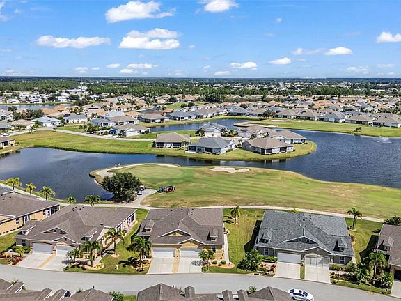 SENSATIONAL villa with majestic views of first hole, water/fountains and sunrise in the gated golf course/active resort of highly desirable Kings Gate, a 55+ community that is NOT in a flood zone and does NOT require flood insurance. This amazing villa is loaded with updates - roof 2023, AC 2024, HWH 2023, impact windows throughout and accordion shutters for the enclosed and under air lanai, LVP all throughout, ironstone quartz counters in kitchen and guest bath, SS appliances from 2021, epoxy floor in in garage and lanai, hang down storage in garage, plantation shutters on windows and lanai sliders and more!!! Talk about MOVE-IN ready - come live the Florida dream lifestyle with this amazing view. Step inside this villa and you'll notice the high ceilings - the built-in custom cabinet that can easily be used as a coffee station and/or bar. Open concept seamlessly combines kitchen with dining and living room - which opens up to the enclosed and under air lanai offering SPECTACULAR views of the first hole and water/fountains. Just off the dining room is the study/den. The master bedroom is in the back left of the villa with the guest bedroom in the front right - offering plenty of privacy for both you and your guests. In addition to the guest bath this villa also offers a 1/2 bath plus, large laundry room with extra cabinets. And if you haven't been to Kings Gate before - you're going to love the options for activity (Olympic size heated swimming pool and spa, tennis courts, pickle ball, lawn bowling, shuffle board, bocce, horseshoes, gym, billiards, library, euchre, bingo, bridge, Texas hold em, poker, mahjong and more). The onsite AND NEWLY REMODELED Lions Den restaurant and bar is super convenient and also offers Tuesday night Karaoke and monthly trivia contests. Many residents love the fact that they are just a golf cart ride away from the shopping plaza that provides you access to grocery store (ALDI), drug store, bank, restaurants and shopping. Want to explore outside of Kings Gate – you are minutes away from the restaurants and shops of downtown Punta Gorda and Fisherman's village. And if you want to explore more of Florida's fun spots you’re near I75 to quickly head north or south. An AWESOME villa with TONS of updates and a SENSATIONAL view in a PREMIER gated community needs to be experienced. Call today for a private showing and a golf cart tour of the community/amenities.