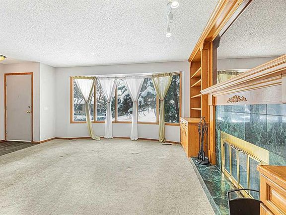 Four-section bay windowCozy wood-burning fireplaceBeautiful built-in oak shelvingKitchen with eat-in areaNew countertop and backsplashVinyl flooring