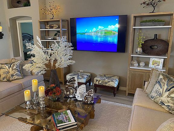 A lovely home on a corner lot, one block from Buena Vista, in the much sought after village of St James, which is 2 miles from both Sumter Landing and Brownwood square. This home is tastefully upgraded with beautiful tile and engineered floors throughout and Java cabinetry. All three bedrooms can accommodate king size beds and the front bedroom has three bay-style windows and a ceiling tray. The primary bedroom has four windows and a ceiling tray and a Roman shower with glass block, plus a custom closet.