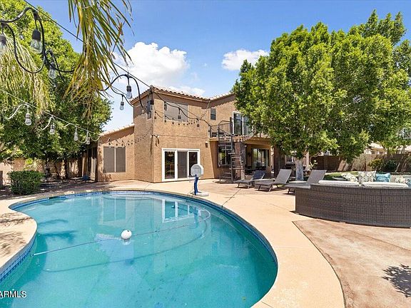PRICE REDUCED! This stunning 4-bedroom plus loft, 3-bathroom home is located in Gilbert with no backyard neighbors! Downstairs features a bedroom and full bathroom, and a large kitchen with plenty of counter and cabinet space. The game/great room has a built-in bar, 2 way fireplace, a pool table, and a theater room just off the great room complete with a projector and movie screen that stay with the home. Upstairs you will find 3 bedrooms, an oversized loft, and a balcony off the master bedroom. Step outside to your backyard paradise with an oversized patio, sparkling pool, and built-in BBQ with countertop for outdoor entertaining. The yard also features a shed, basketball hoop, slab parking, and an RV gate. Don't miss the opportunity to make this exceptional home yours!