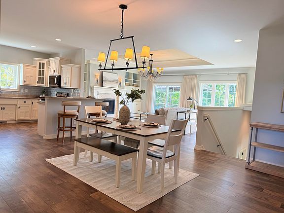 This exquisite zero-lot line home is a SANCTUARY of modern design and comfort without restrictive covenants and HOA fees! DESIGNER elements add a touch of sophistication and character to each room. Gas FIREPLACE, 9' ceilings throughout, incredible kitchen, large pantry, convenient laundry, finished LL with 2 additional bedrooms, a bonus area with even more closets, and a large shared bath. Options for TV in Living Room--above mantel or hide it behind the doors to the right. DECK with pergola overlooks wooded area. HUGE front yard offers so many possibilities! Minutes to Fox River State Recreational Trail, major roads, schools, shopping. Each side is owned separately. Can use neighbors' established lawn care and snow removal or do your own. 48 hours for binding acceptance, please.