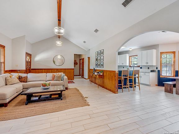 This stunning Texas Hill Country home sits on a fully fenced two-acre lot surrounded by mature oak trees, in the sought-after Cypress Springs community, and school district. Easy access to 281 and Highway 46 makes for an easy commute to San Antonio, Boerne, New Braunfels, and the surrounding areas. The stone exterior and oversized front porch add to its charm and curb appeal. The roof was replaced approx 2 years ago, and the electric gate for privacy. Inside, the living area welcomes you with a cozy corner fireplace that features a mantel and hearth. The beamed vaulted ceiling and accent lighting create a warm and inviting atmosphere, perfect for gatherings. Throughout the entire home, you'll find easy-to-maintain ceramic tile flooring, which not only adds a touch of elegance but also simplifies cleaning. An open archway leads to a well-appointed kitchen boasting quartz counters, a subway tile backsplash, stainless steel appliances, and a convenient breakfast bar. The half-wall wainscoting adds a classic touch to the wood-trimmed windows and doors that are present throughout the house. The primary bedroom suite is spacious and receives ample natural light through two large windows. The full bathroom attached to the primary suite features a quartz countertop and under-cabinet storage, adding both functionality and style. The property's outdoor space offers a small pool where you can relax and cool off while enjoying your favorite beverage. Overall, this Texas Hill Country home embodies both comfort and aesthetic appeal, combining indoor and outdoor features that contribute to a delightful living experience. Cypress Springs has wonderful neighborhood amenities which include a private waterfront access park, which has RV hookups, campsites, a volleyball court, a barbecue area, and more.