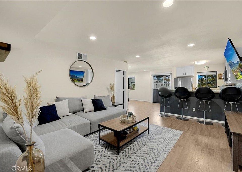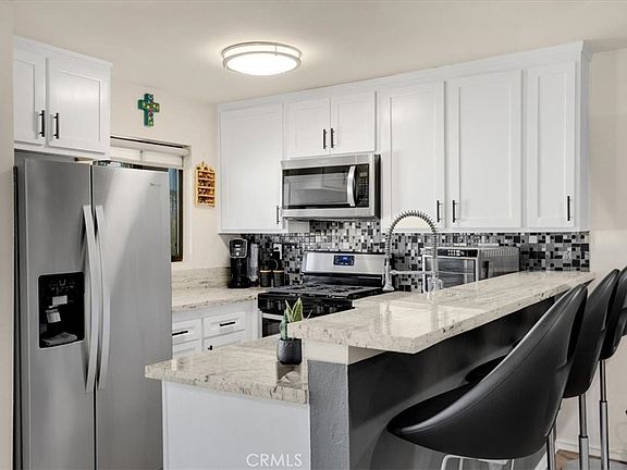 This top-floor, end-unit condo boasts a spacious 2-bedroom, 2-bathroom layout with an open floor plan designed for modern living. Step inside to discover laminate floors, a remodeled kitchen featuring sleek stainless steel appliances, and upgraded bathroom vanities. Bask in the abundant natural light streaming through the windows, or step onto your private balcony—perfect for BBQs or simply unwinding. Enjoy the added comfort of a rare HVAC system, along with smart home upgrades like a Nest thermostat and Blink doorbell. Plus, this is one of only six units in the community offering two assigned covered parking spaces. Tarzana Plaza amenities include a community pool & spa, two laundry rooms on each level, and bbq area. HOA fees also cover water, sewer, and trash. Conveniently located near the 101 and 405 freeways and just minutes from Ventura Boulevard, you’ll be close to the best shopping, dining, and entertainment Tarzana has to offer. Don’t miss this opportunity to own a stylish, move-in-ready condo in a prime location!