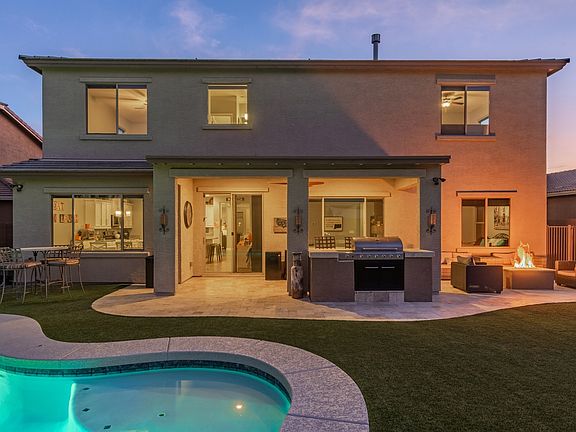 Pride of Ownership boasts in this thoughtfully designed home! From the moment you enter you'll be impressed with the soaring ceilings, custom interior paint, wood plank tile floors and spacious rooms. Living Room & Dining Room are open yet defined spaces. The kitchen has been updated with white staggered cabinets that have rollout trays & garbage can, modern hardware, stainless steel appliances including a double oven, granite countertops, massive kitchen island & elegant lighting. The kitchen is open to the Great Room & Nook that is large enough to accommodate a farm house table. The Great Room features a gas fireplace with a wooden mantle and wood plank niches. The main level also includes one bedroom and full bathroom. Upstairs you'll find two Lofts, Master Bedroom & Bathroom, 3 Guest Bedrooms and a Guest Bathroom. The Backyard is an ideal place to host gatherings w/ the extended Travertine tile patio, built-in BBQ, fire pit, artificial turf, fruit trees and a sparkling pool to keep you cool in the summer!