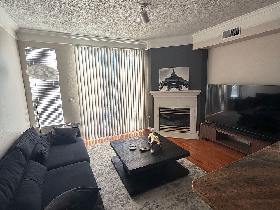The open-concept main floor showcases rich wood floors, soaring ceilings, and custom built-ins that create a seamless flow between the living, kitchen, and dining areas. The modern chef's kitchen stands out with a large island, exquisite Tiger's Eye granite countertops, newer stainless steel appliances, soft-close cabinetry, and a sleek tile backsplash perfect for entertaining or everyday living. The living room, centered around a cozy gas fireplace, extends to a south-facing balcony with sweeping views of parks and open space.