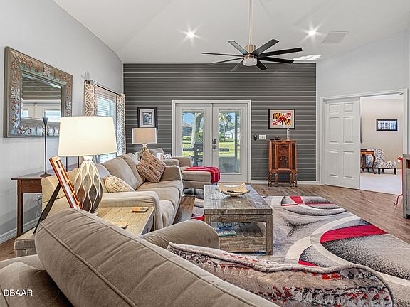 Welcome to Turnbull Bay Country Club Estates! This beautifully maintained three-bedroom, two-bath home offers the perfect blend of comfort and functionality. Step inside to an open floor plan featuring a spacious living room that flows seamlessly into the updated kitchen, ideal for entertaining and everyday living. The kitchen boasts elegant quartz countertops, a breakfast bar and top-quality appliances including a new refrigerator, gas stove, and dual gas/electric oven, perfect for the home chef! The master suite features a generous walk-in closet, and large shower area, providing a private retreat after a day of golf. Two additional bedrooms offer plenty of space for family, guests, or a home office-one even includes a built-in safe room for added peace of mind. Outdoor features include a large wraparound screened-in lanai, overlooking a tranquil pond, and a spacious two-car garage. A brand new roof, skylight and seamless gutters are scheduled for installation on 11/14/25.