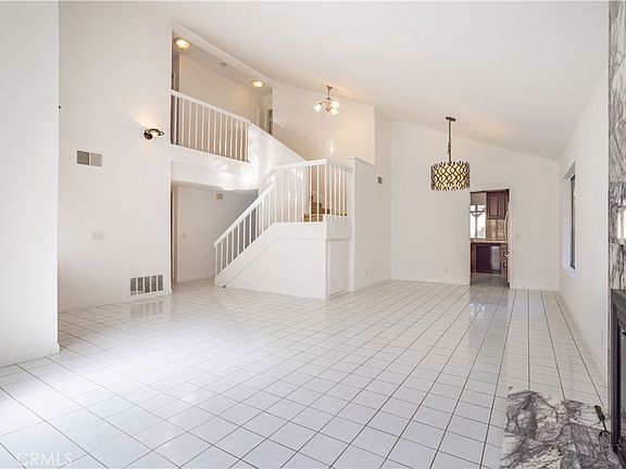 This spacious residence features a large living room with vaulted ceilings, a formal dining room, and a cozy family room. The main level includes a guest bedroom conveniently located next to a remodeled bathroom, while the upstairs boasts three generously sized bedrooms, including a luxurious primary suite. The primary bedroom is a true retreat with vaulted ceilings, an en-suite bathroom, abundant closet space, and French doors opening to a private balcony.