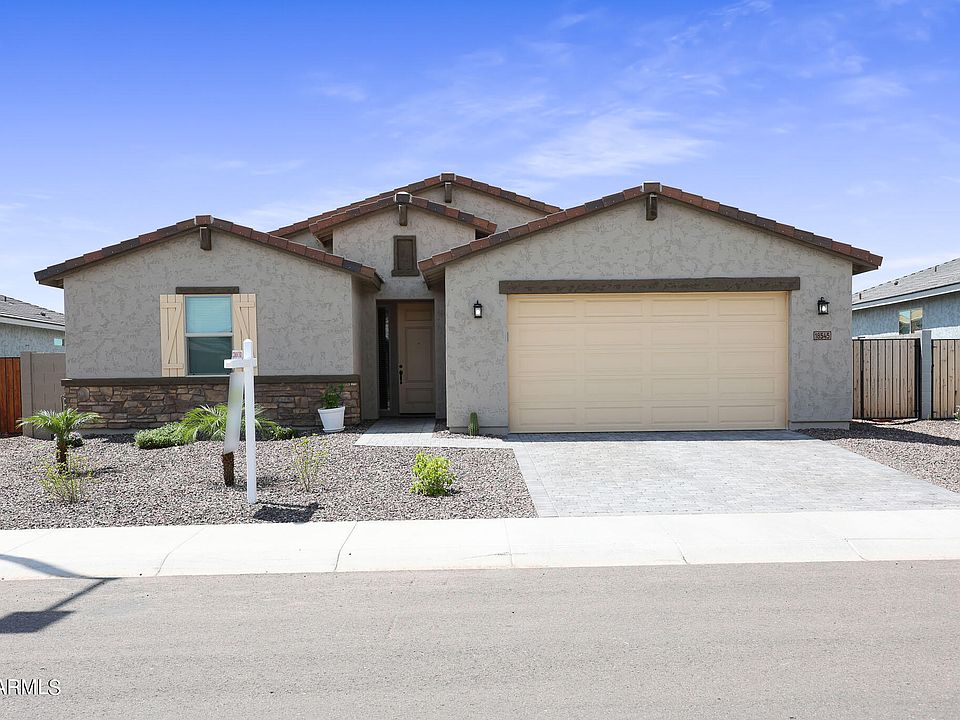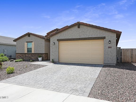 Do you want to feel like you're in a rural area with the convenience of amenities only a few miles away? Then this is the home for you! This perfect location offers an oversized lot with extra space between homes and NO Neighbors behind for added privacy. The large backyard has beautiful views of the White Tank Mountains only a few miles away and Gorgeous sunsets! The Floorplan (please see in photos) has a Fabulous true split with 2 Bedrooms up front and a Full Bath - down the Entry Hall and on the opposite side is another Bedroom and another Bath with a shower and the Primary Bedroom has its own entrance off the Great Room. A Flex Room is off the main entry hallway - could be anything you want Den/Playroom/Dining. There is a separate, large Laundry Room - Washer & Dryer included - with plumbing for a sink. The Garage is a full 3 car tandem and enters directly into a side hallway (no having to go through the laundry room to enter the home). The Great Room, Kitchen and Dining Area are all one large space with a slider door to the back patio off the dining area and a HUGE 3 panel slider that opens off the Great Room onto the covered patio. The Kitchen has a HUGE Island with Granite Counters and Upgraded cabinetry with cabinet and under cabinet lighting, separate gas cooktop with decorative hood, built-in Wall Oven and Microwave. Beautiful wood look tile is throughout and carpet in the Bedrooms. There is a nice sized covered patio with a landscaped backyard. The paver patio leads out into the yard surrounded by perpetually green turf to view the Stunning AZ sunsets behind the White Tank Mountains. No Neighbors behind! This home offers so much, you must see to truly appreciate it!