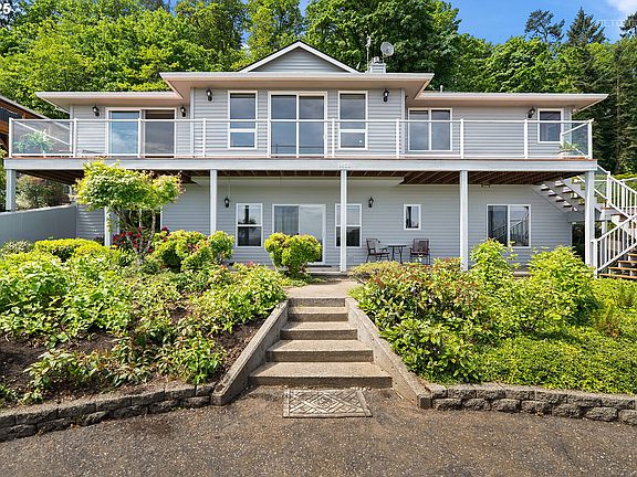 Enjoy the panoramic view of the Columbia River and Cascade Mountains from this beautifully maintained home perched at the top of the neighborhood in charming Columbia City! The generous 0.47-acre lot features manicured, easy-care landscaping with no lawn mower needed, a nice path leading up to the wooded property at the back, and a circular driveway that ensures effortless access. It’s easy to drive up into the garage and enjoy convenient main-level living. The spacious living room features coved ceilings and a cozy gas fireplace that frames the stunning views. The well-appointed kitchen includes granite countertops, a cook island, abundant cabinetry, and a light-filled nook area—perfect for morning coffee while taking in the scenery. There are 2 bedrooms on the main level, including the primary suite, which also offers coved ceilings, access to the deck, and a private bath with a soaking tub for relaxation. The lower level adds flexibility with two additional bedrooms, a full bath, and a comfortable family room with a second gas fireplace—ideal for guests or a separate living area. The home has been well cared for and recent updates include a new roof (2019) and fresh exterior paint (2022), making this home move-in ready. Columbia City is a gem of a little town with very little turnover in this neighborhood. It is hard to find a view like this at this price in the Portland area, and yet still have an easy commute into the metro area.