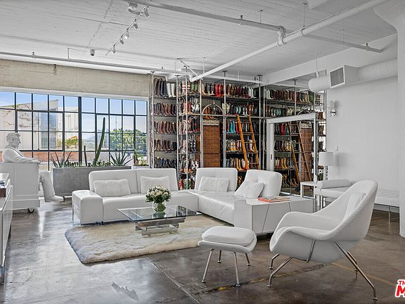 Stunning double size industrial modern loft in the Arts District's premier building, the Toy Factory. Unique and immaculate with impressive sharp lines, polished concrete floors, designer kitchen and bathrooms, 12 foot high ceilings, and an over 800 sf bedroom suite with large southern facing casement windows. Towering built-in bookshelf with library ladder, built-in sound system and speakers, ample storage, and black stainless steel appliances complete this one of a kind home. Originally two separate units (307 and 308), they have been combined into the largest unit ever offered in the full service Toy Factory building aside from Penthouse #712 (also a double unit), complete with two separate entrances. The building offers a large garden patio on the same floor, a large rooftop pool and pool deck with sweeping downtown views, on-site gym, 24-hour doorman and security, secured entry parking, and is zoned as a live/work building. Located in the best part of the Arts District walking distance to countless restaurants, cafes, shops, and the Soho Warehouse.