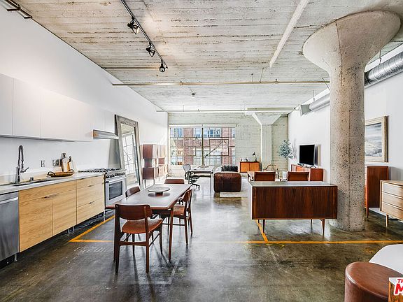 Discover the iconic Toy Factory Lofts, a highly coveted Live/work loft community in the vibrant Arts District of DTLA. This remarkable penthouse loft, a rare find, boasts an expansive open floor plan with impressive 12-foot ceilings, concrete flooring, and striking columns. The loft is illuminated by oversized industrial-style windows recently upgraded with new glass and motorized shades, facing south to invite abundant natural light throughout the space. Recent upgrades include kitchen appliances, including a Bosch gas stove, Samsung refrigerator and dishwasher, and a convenient LG front loading stackable washer-dryer. Building amenities enhance the living experience, offering a secure lobby with a 24-hour doorman, a rooftop pool surrounded by a sun deck that provides breathtaking views and a cozy fire pit, as well as a third-floor communal deck with lush green spaces, barbecue areas, and a two-story gym. Residents will also benefit from an indoor, secured parking space in the attached private garage. Conveniently located just steps away from Hank's Organic Market, Camila, Bestia, Bavel, The Soho House, Factory Kitchen, The Bike Shed Moto Co, and Hauser & Wirth Gallery, this vibrant neighborhood offers an abundance of dining, shopping, and cultural experiences to enjoy.