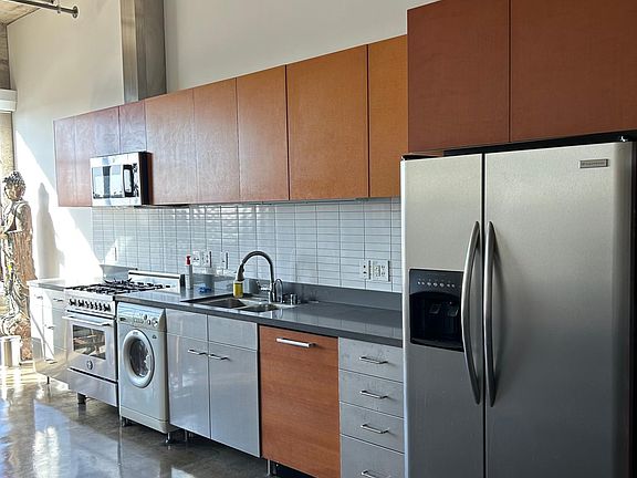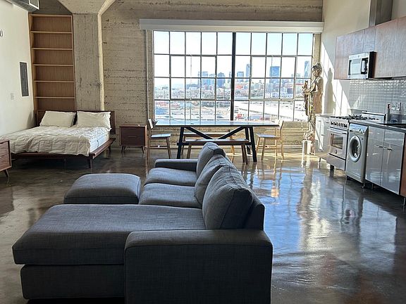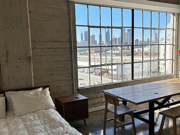 An open floor plan loft with an incredible view of the downtown skyline. The unit has enormous west-facing factory windows which receive beautiful light throughout the day. You are guaranteed incredible sunsets. Remote controlled electronic shades are included (both light filtering and black-out). The unit includes a kitchen with all appliances (large fridge, dishwasher, gas range and oven, microwave, two section sink and ample cupboards storage space). A platform was built to create a lofted bedroom space with a large closet and work space below. The rest of the space is open to be designed and organized at your discretion. The space if partially furnished but can be removed if renter wishes to rent the unit unfurnished. Bathroom includes a big bathtub and a bidet toilet. One parking spot inside garage included. Building has a security and concierge service. Other building amenities include a roof top pool deck with panoramic views of the San Gabriel Mountains and the Downtown skyline, a garden deck on the third floor with a large bbq and ample seating area, and an indoor gym on the ground level. The Arts District is an extremely vibrant neighborhood, filled with excellent restaurants, galleries, and events. One parking spot included in the lease. Utilities are not included. Rent is due the first of every month. A $100 late fee will be assessed if rent is more that 5 days late. Dogs and cats are allowed but must be disclosed to owner.
