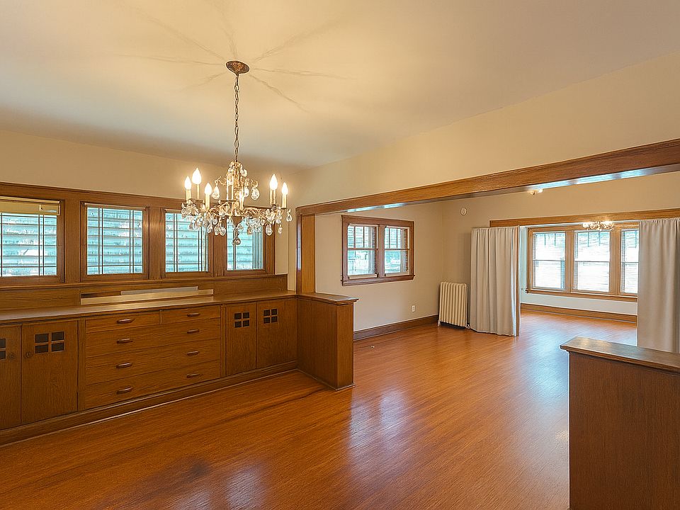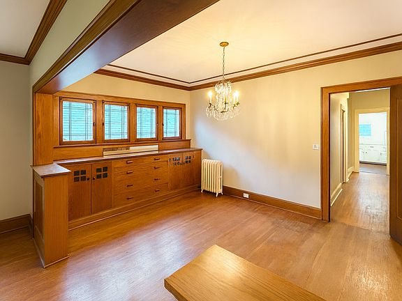 - Hardwood floors, spacious living and dining rooms, closets and charming wood built-ins throughout