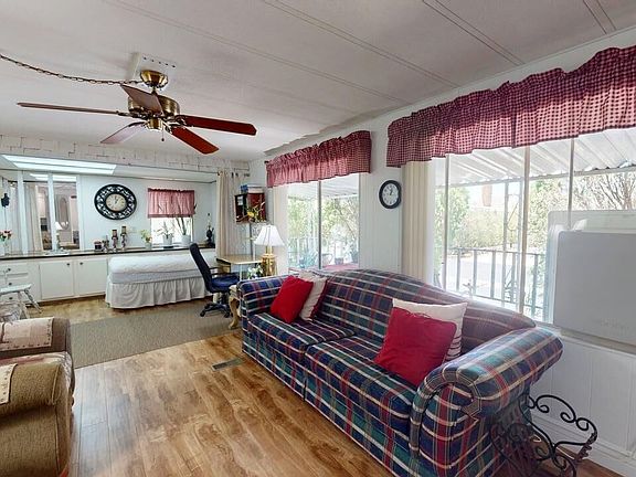 Extremely well maintained home with 1,440sf just perfect for intimate evenings or lively events for family and friends. There is even an extra sleeping space that is curtained off from the main living room area and can be used as a wet bar area. With several exterior plantings, the interior of this home is extremely private. The updated kitchen offers granite counters and a gas stove/range, refrigerator, dishwasher and microwave oven. There are also the regular sized washer and dryer in the mud room that also features access to the hall bath with dual door access. The primary suite is extremely spacious and features the soaking tub, separate stall shower, WC and a large closet. The second bedroom is also extremely spacious and the living, dining and kitchen area are also spacious. The floors are a manufactured hardwood simulated floor - no carpeting - great! The home is being sold furnished but if you have your own furniture, I have a local organization who will come and pick up anything you don't want to keep. This home is easy to show. Desert View MHC offers a large mineral springs pool, indoor spas, a sauna, a large clubhouse for vents with a large kitchen, separate laundry facilities if needed and and additional annex room featuring card tables for jigsaw puzzles, a pool table and a TV with plenty of DVD's. Probably one the Desert's best kept secrets is that the community is very private. It's about a half hour to Costco and Desert Hot Springs many shopping areas and grocery as well as spa resorts. Welcome to your new home!