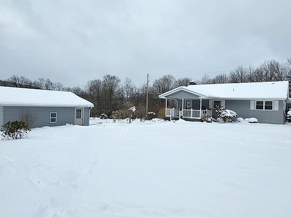 Beautifully udpated ranch home on the outskirts of town sitting on 2.5 acres. Open concept living space between the kitchen and living room is bright and well lit with a wood buring fireplace to create extra warmth and comfort in your new home. Brand new flooring throughout and freshly painted, this homes features 2 beds and 1 spacious, full bath. Washer and dryer are on the first floor also. Three parking spaces with an integral single car garage and a very nice 2 car, detached garage. Full, unfinished, dry basement with a Kinetico water system.