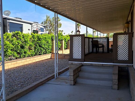 This home is very unique,,, exterior is stucco with a block foundation, Interior is all sheetrock finished, Laminate floors with all solid wood cabinets, also on a corner lot with great views. Also there are two separate master bedrooms with their own baths. The HVAC is new just installed also a new water heater, There are 2 covered parking areas and one uncovered. Desert View is a 55 or older community, it is very peaceful here with impeccable Management and maintenance crew.