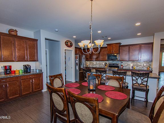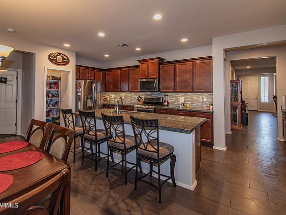 This Home is Massive with 6 bedroom, single story with 3 full bathrooms and owned solar! The front bathroom has a new walk in, jacuzzi tub/shower with changings lights. Loaded with upgrades throughout and many ADA compliant additions. All new smoke alarms and recessed lighting. There's even a bonus nook for an additional fridge inside the home. The backyard has a gorgeous heated pool with water features, changing lights, and views of the White Tank Mountains. There's a convenient app to control all pool systems at anytime from anywhere.