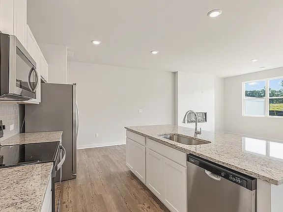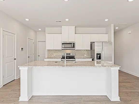 As you enter, you'll be welcomed by luxury vinyl plank flooring and a bright, open-concept main level that's perfect for both relaxing and entertaining. The chef-inspired kitchen features granite countertops, a stylish tile backsplash, 36-inch cabinets with crown molding, stainless steel appliances, and a large center island ideal for morning coffee or gathering with friends.