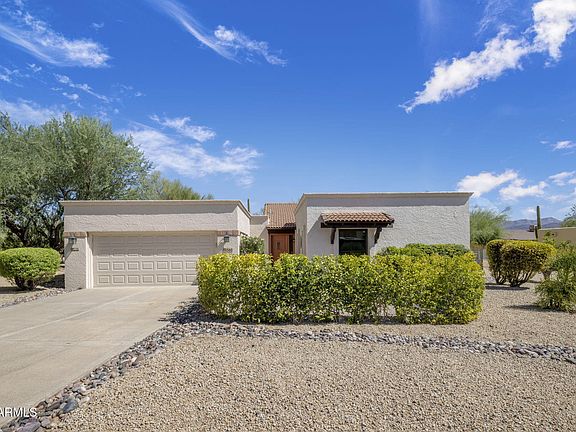 Welcome to this charming 2-bedroom, 2-bathroom home in the sought-after Rio Verde golf community. Perfectly situated on an oversized lot of nearly 16,000 sq. ft., this 1,408 sq. ft. residence offers comfort, space, and a light-filled floor plan. Cathedral ceilings and abundant windows create an airy feel throughout the living spaces, while the spacious primary suite provides a private retreat with room to relax. The kitchen and dining areas flow seamlessly for everyday living and entertaining. Step outside to the covered back patio and enjoy the expansive lot with endless potential for outdoor living. A 2-car garage adds convenience and storage. With its oversized lot, natural light, and welcoming design, this Rio Verde gem is ready to be enjoyed.