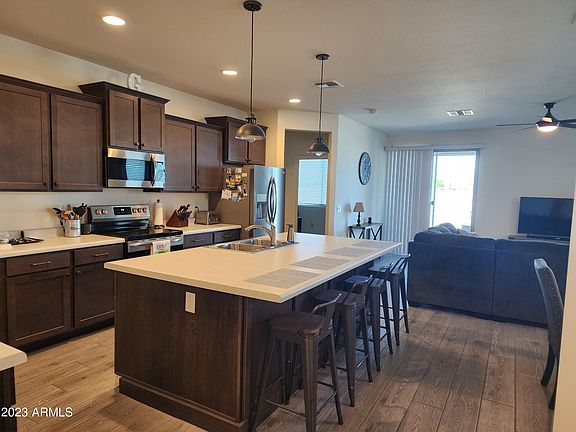 YES, an RV neighborhood where you can store your RV above the fence line! This house is Beautiful and SHOWS LIKE A MODEL! Modern wood-look plank flooring, open spacious kitchen with a generous island that has cabinets on both sides! Staggered cabinets with crown molding, pendant lights and even a ''coffee corner''! A great floor plan with split owners suite, large family room/dining area and a laundry room with a doggy door built in! Private lot with no back or side neighbor as it sides common area, the mountain views are gorgeous! The 2 car garage has an access door to the side yard, added canned lights and ceiling fan! So many features in this home, don't miss this one!!