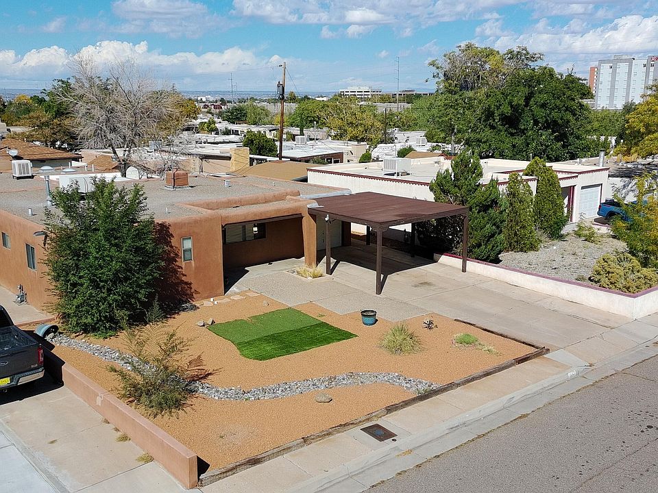 Single-story Pueblo-style home near Uptown ABQ w/4BR, 3BA & 2 owner suites! Features original oak hardwood under carpet, large picture window in living area, & updated baths incl. cultured marble surrounds. Kitchen offers upgraded cabinetry, SS 5-burner gas range, vent hood, DW, built-in desk, breakfast nook & window overlooking backyard. Large laundry rm w/folding table & gas hook-ups. Hot-water baseboard heat, 2 evap units (1 MasterCool + 1 traditional), new boiler, pumps & venting. Backyard w/covered patio, bancos, stuccoed block walls. 1-car garage + expanded carport.