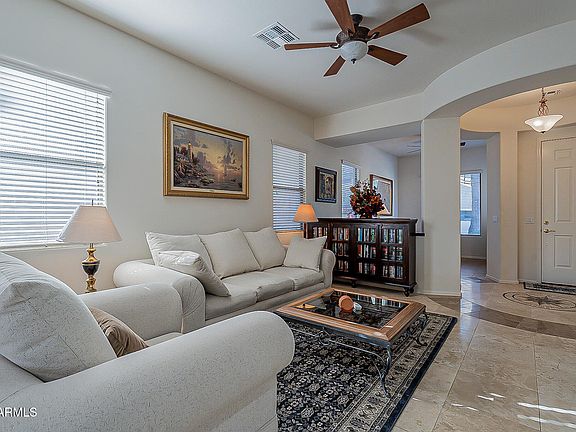Located in the gated community of Montefino Village, close to the Ocotillo Golf Club and within walking distance to Intel's Ocotillo campus. This home is fully furnished with all tile floors, with the exception of the Master Bedroom, which is carpeted. Master has a King bed and 2nd bedroom has a Queen bed. 10 ft ceilings with ceiling fans throughout. New roof, AC, hot water heater, refrigerator, and dishwasher installed in 2021. New water softener installed in 2024. Kitchen has a gas range. Tiled patio with gas grill.