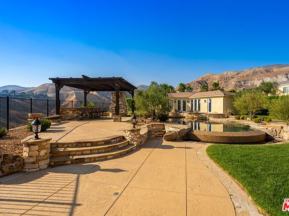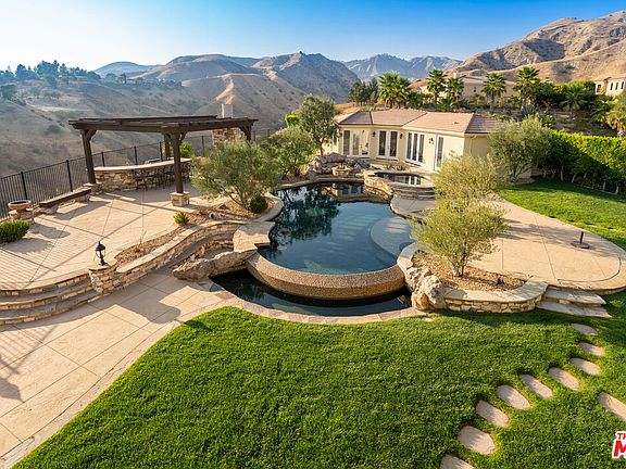 Stunning Mediterranean Estate with explosive city, mountain and canyon views located in the exclusive Cagney Ranch Estates. This 6,764 SF turnkey home was recently renovated and includes a brand new 1,100 SF detached guesthouse that overlooks the large resort style backyard. There is a beautiful swimming pool with infinity edge and swim-up bar, spa, waterfalls, fire bowls, putting green, 2 outdoor kitchens with BBQs, one with its own gazebo, bar seating area and fireplace. The outdoor living area is spectacular, filled with olive trees and offers massive entertaining space with panoramic views. The home features 7 beds, 7 baths, an open floor plan with high ceilings, large kitchen, dining room with exposed beams, separate bar area. Master suite includes 2 private balconies with views, spa-like bath and 2 spacious walk-in closets. 5-car garage. Property is perfectly situated at the end of a private cul-de-sac on one of the largest lots in the neighborhood. Truly move in ready!