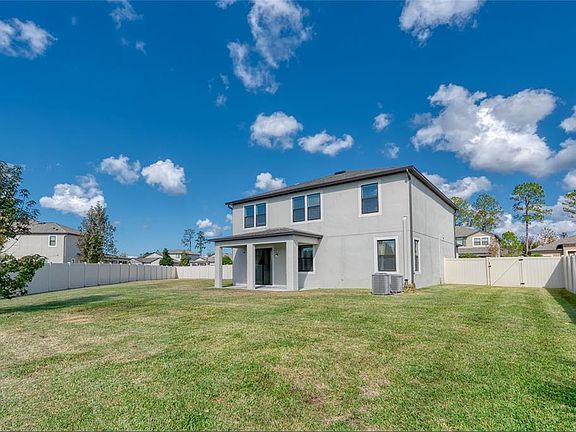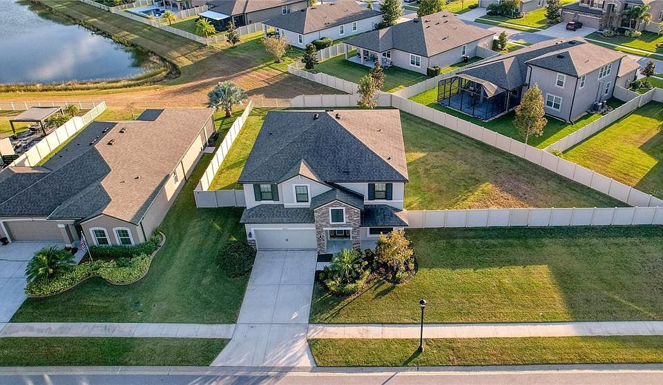 This is the kind of home that just works—and it's bigger than you think. Built in 2019 by M/I Homes, this spacious 2,890 square foot, 4-bedroom plus den is located in Talavera on one of the largest fully fenced lots in the community—one of those communities where families are actually outside playing and neighbors know each other. The moment you pull up, you'll notice the covered front porch (the kind that makes you want to add rocking chairs and actually use it). Step inside and it feels right. There's a welcoming foyer with a den/study right off to the side—perfect home office, playroom, or honestly? It could easily be a fifth bedroom if you need the space. The heart of the home is the large open kitchen and dining area that flows seamlessly into the living room. No walls cutting things off, just good sight lines so you can cook dinner while keeping an eye on homework, conversations, or whatever's happening in the living room. The first floor also features a large laundry room with washer and dryer included—convenient and spacious, making laundry day actually manageable. Upstairs is where the bedrooms are. There's a bonus loft space at the top of the stairs—another flex area that becomes whatever your family needs. Game space? Reading nook? Secondary hangout spot so the teens aren't always underfoot? You decide. The primary bedroom is legitimately spacious with two large walk-in closets (not those fake "technically walk-in" closets—actual storage space). The en suite bath has a large tiled shower that feels spa-like without being over the top. The backyard is where you'll spend your time—and there's a LOT of it. A large covered lanai extends your living space outside, and the fully fenced yard is massive—seriously, one of the biggest you'll find in this community—with a water view. It's the kind of setup where you can let the dogs out without worry, host summer barbecues without feeling cramped, set up a playset, toss a football around, or just sit out there with morning coffee and enjoy the view. If outdoor space matters to you, this is it. Talavera is the kind of community families stay in. Swimming pool, playgrounds, tennis and basketball courts, splashpad, and a cabana with meeting areas. It's designed for families who actually want to be part of a community, not just live near other houses. This home is move-in ready—a generous 2,890 square feet with 4 bedrooms plus den, 2.5 baths, built in 2019 so everything's still in great shape. No projects waiting for you, just a really solid, spacious home with an enormous yard in a great neighborhood. Come see it.