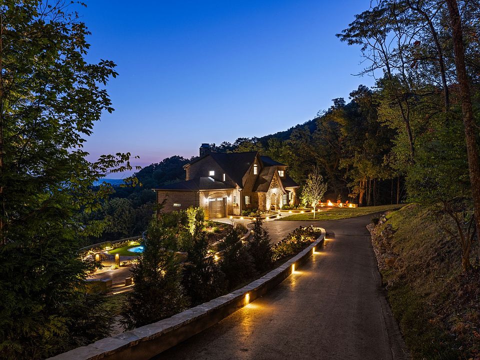 Nestled within the treasure of unexpected, hidden hills in Williamson County, this custom estate rests at the peak of highly sought-after Burke Hollow Road, unfolding across over eight acres of beautiful Tennessee landscape. It offers the charm of a private mountain lodge with the elegance of a luxury retreat- inspired by the timeless beauty of the Grove Park Inn. From its elevated vantage point, enjoy sweeping, unobstructed views, including Music City’s distant lights, creating a setting that feels both peaceful and extraordinary. Here, grandeur is defined by the way the home lives—flowing effortlessly with its breathtaking surroundings, so deeply connected to the natural landscape that it feels as though it has no end. Across three levels of living, you’ll find four bedrooms and four and a half baths, where thoughtful design meets everyday comfort. The main level showcases an expansive covered and uncovered wraparound deck off the kitchen and living room—perfect for entertaining large gatherings or enjoying retreat-like seclusion with panoramic views. The lower level impresses with soaring ceilings over grand living and dining areas, recreational spaces, full bath and secondary laundry, with adjoining oversized 2-car garage- all seamlessly connecting to multiple natural stone patios, heated resort-style pool, and hot tub. An entertainer’s dream that effortlessly blends luxury indoor and outdoor living. Upstairs, the primary suite opens to a private covered deck, a tranquil perch for quiet mornings or sunset views.