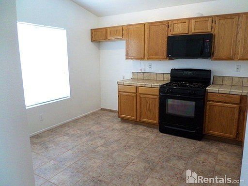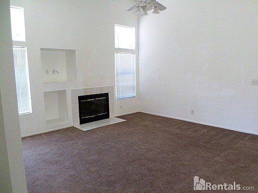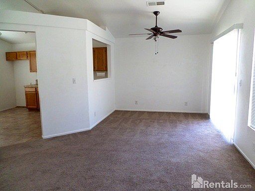 RARE TO FIND BEAUTIFUL SINGLE STORY HOME! Convenient to Park & Ride and Freeway. There are 2 bedrooms and a den that can be used as another bedroom plus 2 full baths. Kitchen has space to put a small dining table and there is a separate formal dining room area, it also includes a brand new dishwasher! A nice feature is a pass through from the kitchen to the dining room. Living room is spacious with a fireplace and nook for a TV. Master bedroom is spacious, has sliding door to back yard and it has a private bath. The secondary bedroom is good sized. Flooring is tile and carpet. A single story home will run more efficient in the desert summer for A/C. Two car garage with plenty of room for storage. Landscaping included.