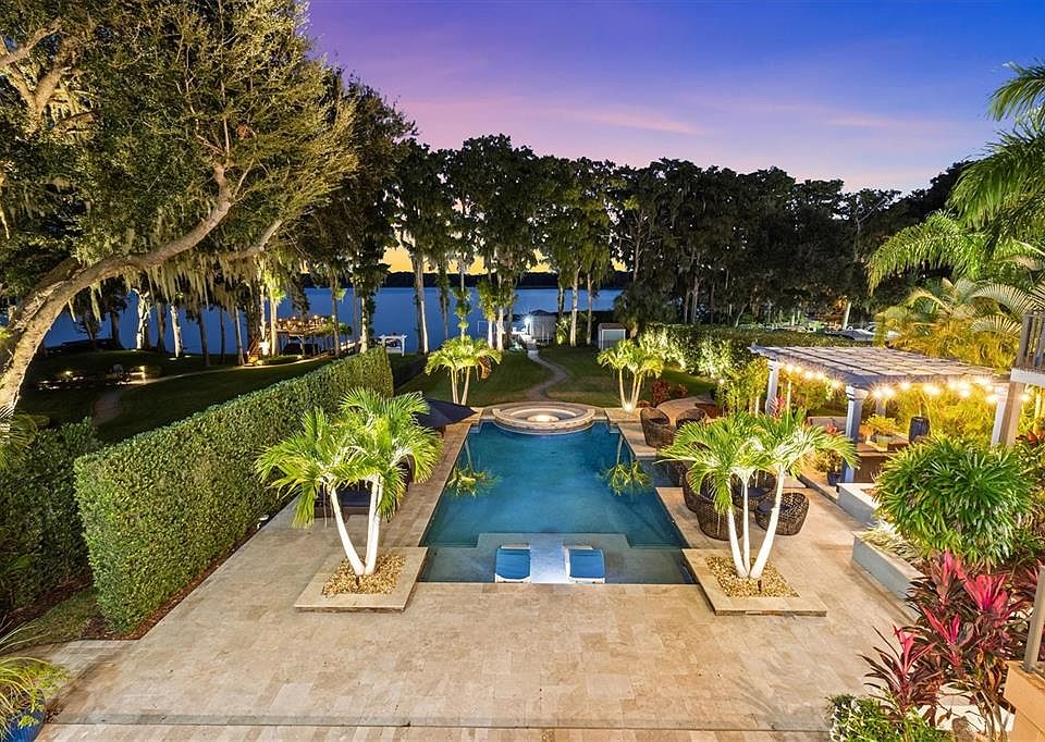 Inspired Waterfront Living on Lake Tarpon Discover this stunning 7,682 SF estate which includes a full guest apartment on nearly one acre offering breathtaking views of the 2,500-acre Lake Tarpon. Gated for privacy, it features a private dock with 10,000-lb boat lift for sunset cruises, fishing, or kayaking, all with no HOA fees or flood insurance required. Nestled in the prestigious Palm Harbor University school zone, this move-in-ready haven combines serene lakefront allure with sophisticated luxury for discerning buyers. Over $400K invested in a "backyard nirvana" by acclaimed designer Ryan Hughes creates an unparalleled outdoor oasis: resort-style pool with ledge loungers, glistening tiled infinity-edge spa, sunken fire lounge, charming pergola, cozy moon daybed for stargazing, and dramatic custom lighting blending light, water, and fire across travertine decking amid stately grandfather oaks and vibrant tropical landscaping. The extensive covered lanai seamlessly connects to indoor spaces, ideal for gatherings, while the open floor plan greets with immediate lake views through walls of glass in the expansive family room, accented by a fireplace and decorative tray ceiling. Inside, the chef's kitchen shines with quartzite island and granite countertops, custom cabinetry, Wolf commercial gas range, SubZero appliances, double ovens, walk-in pantry, and casual dining. The main-level owner's retreat boasts a beamed vaulted ceiling, serene lake views, dual closets, and spa bath with jetted tub and shower. Lower-level entertainment includes a bonus room with full wet bar, home theater, home gym, extra storage, three bedrooms, two baths, new tile, 2nd laundry room and lots of storage—plus a separate in-law suite with full kitchen, living/dining, and laundry. Recent updates feature a brand-new roof (2025), five AC units replaced since 2019, 3 tankless water heaters, whole-home water softener/filtration, fresh paint, extended driveway, Generator, dedicated podcast room, and tech-savvy amenities like WiFi 6, Sonos audio, Mohen AI leak detection, integrated security, and smart locks. Accessed via gated cobblestone entry to a spacious motor court and Trex-decked porch, this unmatched property redefines waterfront sophistication.
