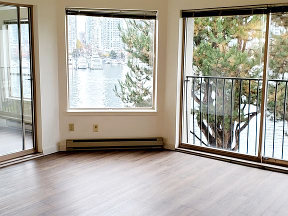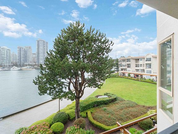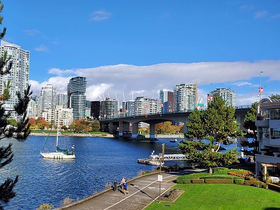 WATERFRONT, Rare, Panoramic WATER VIEW, False Creek, downtown scenic skyline! San Remo Court at The Regatti. Gorgeous Water views from living room, den, master bedroom & outdoor balcony! Large windows! Seawall. Rare FREEHOLD home in False Creek! Spacious 1173 sq ft- 2 bedroom & huge flex/den, large kitchen, walk-in closet, balcony, gas fireplace, 1 parking (#54), 1 locker (#25. Room-1). Excellent Amenities- indoor pool, hot tub, sauna, steam room, caretaker, ping pong table, gym, clubhouse, 2 pets allowed, lots visitors parking, EV charging, easy access- mins to downtown, city hall, Olympic Village, Canada Line skytrain, Aqua bus to Yaletown & Granville Island. See 3-D Matterport in VTour Link. Professionally Newly painted, laminate flooring & cleaned! Move in condition! New dishwasher.