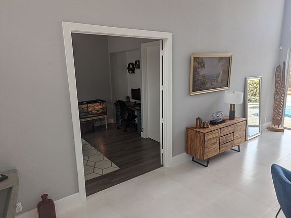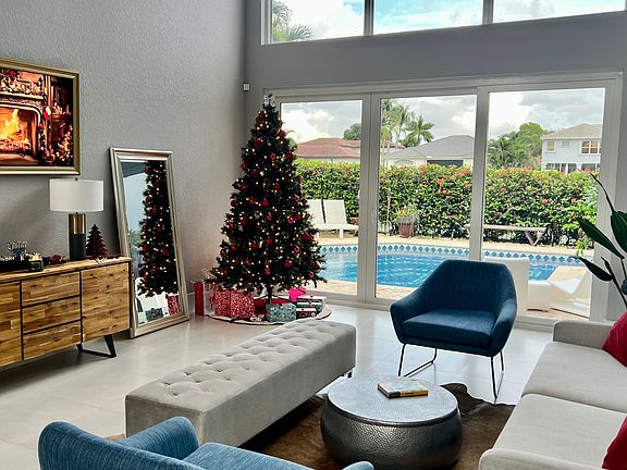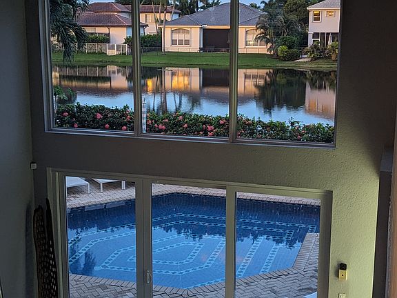 Fully furnished beautiful home overlooking a pond in a safe neighborhood with security gates that features numerous upgrades, including newly installed impact windows and doors throughout the house, automatic blinds for main bedrooms, retractable outdoor space screens, heated pool, etc. The home features a pool table, a foosball table and a massage chair. The yard has a heated pool, an outdoor covered area with a TV, dining table and lounge area with fireplace and grill. There is also a mango tree in the yard.