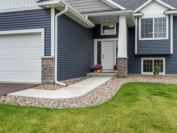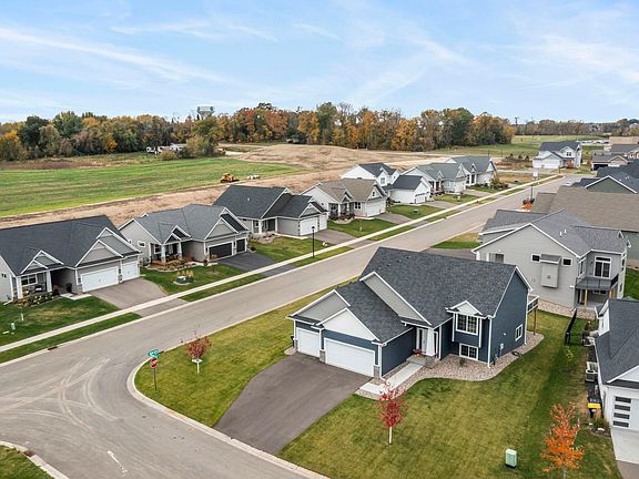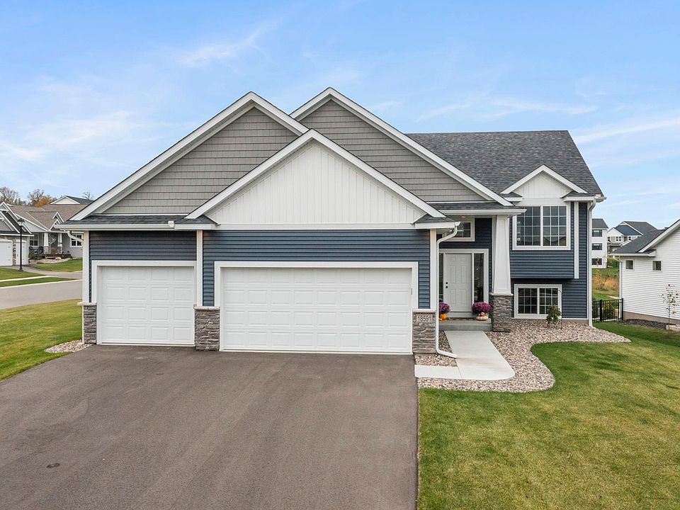 Modern, stylish with many upgrades and expansive corner lot showcasing serene pond views from the low-maintenance deck. 2024 built and move-in ready! Don’t wait to build, this fabulous home is just like new and only available due to relocation. Charming Craftsman-Style woodwork and doors throughout. Located near Highview Elementary parks/trails/ fields. Beautifully designed home offers timeless character with modern functionality. Towering vaulted ceilings and spacious, open foyer. Warm wood cabinetry, detailed millwork, and quality finishes create an inviting atmosphere. Spacious 5-bedroom floor plan w/ a Primary Suite, 3 bedrooms on the one level. Gorgeous quartz countertops, a center island with breakfast bar seating, and stainless-steel appliances that complement the home’s classic aesthetic. Ample windows and thoughtful lighting bring in natural warmth and brightness. Neutral paint and flooring, sprinkler system, water softener, and oversized 3-car garage. Nestled in a prime Lakeville neighborhood known for its excellent schools, parks, and community charm. Exciting future amenities at Grand Prairie Park—just a short walk away—will include a splash pad, pickleball courts, playground, and more, creating the perfect neighborhood retreat with NO HOA fees. Short drive to downtown Lakeville shops/restaurants and more. This growing area is a perfect place to call home!