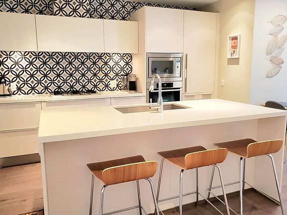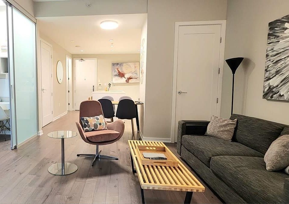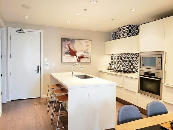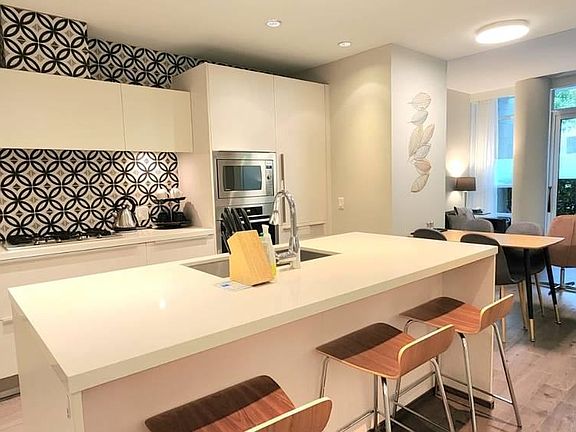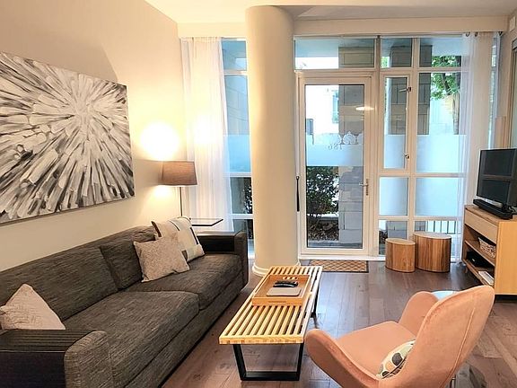 Step into this stunning 670 sqft townhome, where soaring 12-foot ceilings and quality hardwood floors create an expansive, luxurious feel. The gourmet open kitchen is an entertainer's delight, featuring a massive 12-foot granite island and custom cabinetry that seamlessly conceals the high-end fridge/freezer. Every detail has been thoughtfully chosen, including beautiful furnishings and a top-quality queen bed with built-in storage. Unbeatable Amenities: Access both the building amenities (Concierge, Gym, Lounge, Secure Parking) AND the prestigious Gold Medal Club (Indoor Pool, Hot Tub, Steam Room, Huge Gym). Pet Lovers Rejoice! A dog park and the beautiful seawall are just one block away. Pets are welcome with owner approval.
