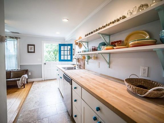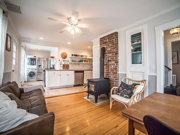 Cozy 2 bed 1 bath single family home for rent in Tiverton, RI starting May 1st (earlier move-in might be possible). Unfurnished. Long term rental preferred. Our 1882 cape cod style farmhouse has all hardwood and tile floors, stainless steel appliances including dishwasher, gas stove, and brand new front load washer and dryer on the main floor. Wood burning stove for supplemental heat and winter coziness. Clawfoot tub and separate shower in big and bright main floor bathroom. Primary bedroom fits king size bed. 2nd bedroom is a great kids room or office. House is bright and airy, freshly painted inside, with tons of windows and skylights, and an open concept layout with lots of natural light. Two floors plus basement: two bedrooms upstairs; kitchen, bathroom, living room, dining room and laundry on main floor; plenty of storage space in full height unfinished basement. Huge and private fully fenced half acre backyard with lots of flowers and trees, a chicken coop (or garden shed if you don't want chickens) and raised beds for starting your vegetable garden this spring. Pet friendly (dogs, cats, chickens all ok) with an additional pet rent of $25-$50 per month depending on the kind, number and size of the pets. Quiet country living in a great school district with easy access to Highway 24, only a 25 min drive to Providence or Dartmouth. Off street parking for multiple cars. Heat and utilities not included (you pay for heating oil, propane for gas stove, and electricity). Town water. No indoor smokers please. If you have any questions please feel free to ask! We'll be showing the house by appointment to interested renters from April 6th to 11th, no showings before or after that week. Tenant is responsible for heat, utilities, snow removal, lawn care (gas lawnmower provided), and gardening. No smoking inside.