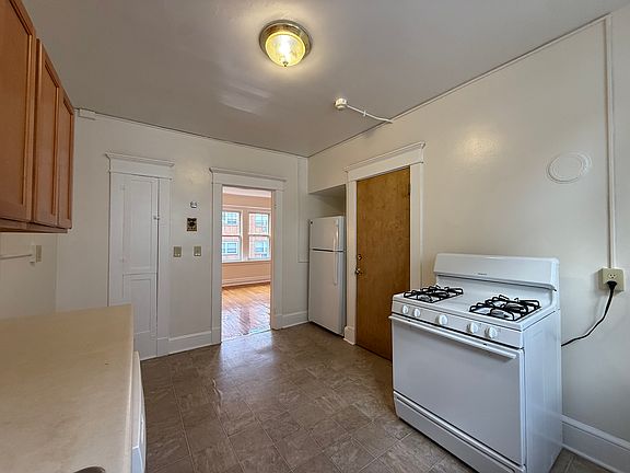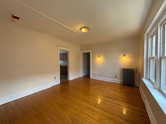 This apartment on Elm Street in New Haven offers a classic, charming living space. The property features beautiful hardwood floors in the main living areas and bedroom, as well as period details for example built-in wall sconces. The kitchen is equipped with a stove, dishwasher, and ample wood cabinetry. The bathroom is equipped classic tilework and a pedestal sink. The bedroom is spacious with good natural light from two windows and includes a closet for storage.