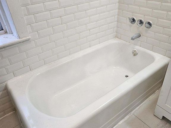 Renovated bath with tubLarge parking lotDesignated tenant parking spaceWell sized bedroomSmall hallwaysWhite shaker cabinetsCeramic tile flooring